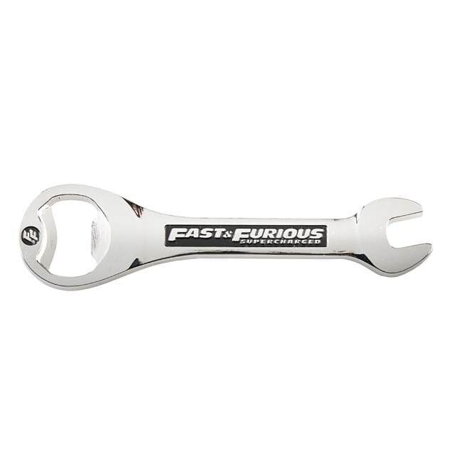 Crack open a cold one with this Fast & Furious themed bottle opener. Shaped like a wrench, this comfortable design also features a magnetic back for easy storage on a refrigerator or metal surface.